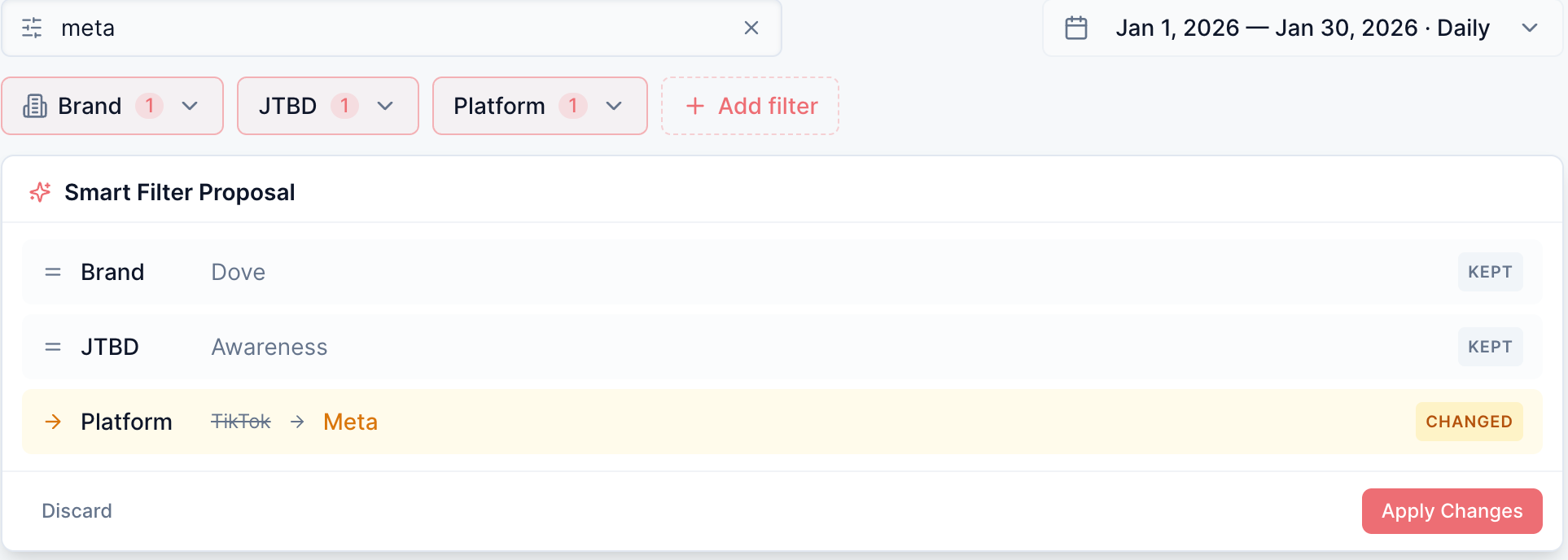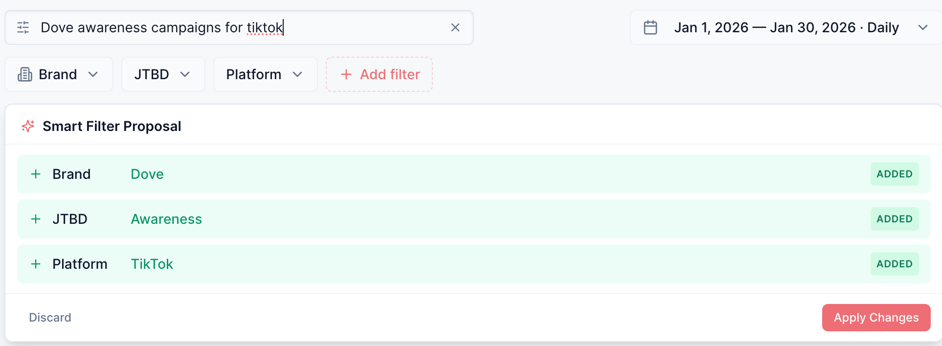 The active summary line (e.g., Brand: Dove · JTBD: Awareness · Platform: TikTok) appears below the input whenever you have active filters and the input is empty, so you always know what's applied.