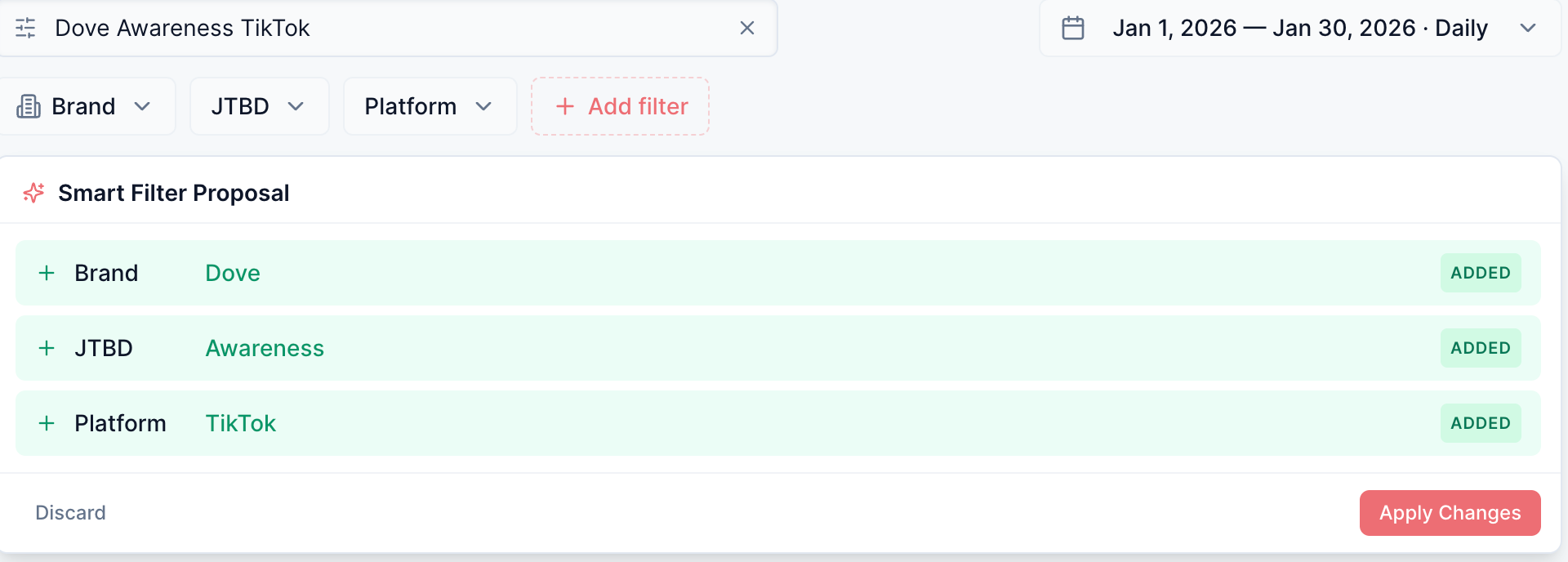 This instantly sets Brand → Dove, JTBD → Awareness, and Platform → TikTok — all at once.